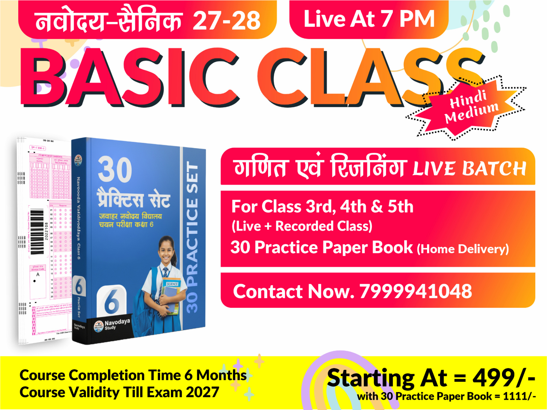 यह कोर्स उन विद्यार्थियों के लिए तैयार किया गया है जो नवोदय-सैनिक प्रवेश परीक्षा 2027, 2028 एवं 2029 में कक्षा 6वीं में प्रवेश के लिए आवेदन करेंगे। विशेष रूप से कक्षा 3री, 4थी और 5वीं में अध्ययनरत विद्यार्थियों को लक्षित करते हुए, इस कोर्स का उद्देश्य परीक्षा की तैयारी से पहले बुनियादी ज्ञान को मजबूत करना है। कोर्स की प्रमुख विशेषताएं: ✔️ विषयवार तैयारी: अंकगणित के सभी अध्याय, वर्बल और नॉन-वर्बल रीजनिंग पर ध्यान, जो नवोदय और सैनिक स्कूल परीक्षा के लिए अनिवार्य हैं। ✔️ लाइव कक्षाएं: 1 जनवरी 2026 से जून 2026 तक 6 महीनों में ऑनलाइन लाइव कक्षाओं के माध्यम से पूरा होगा। ✔️ रिकॉर्डिंग सुविधा: सभी लाइव कक्षाओं की रिकॉर्डिंग नवोदय प्रवेश परीक्षा 2026 तक उपलब्ध रहेगी। ✔️ हिंदी माध्यम: कोर्स को हिंदी भाषा में पढ़ाया जाएगा, ताकि विद्यार्थी आसानी से समझ सकें। ✔️ अध्ययन सामग्री: ₹1111 पर नवोदय के 30 प्रैक्टिस सेट बुक (न्यू सिलेबस के अनुसार) उपलब्ध होंगे (इसमें OMR SHEET शामिल नहीं है) जिसे विद्यार्थी के पते पर डाक द्वारा भेजे जाएंगे। अतिरिक्त लाभ: यदि आप प्रैक्टिस बुक नहीं लेना चाहते, तो कूपन कोड NOBOOK का उपयोग कर शुल्क में छूट प्राप्त कर सकते हैं। यह कोर्स आपके बच्चे को परीक्षा के लिए आवश्यक बुनियादी ज्ञान और आत्मविश्वास प्रदान करेगा। लाइव कक्षाओं, अध्ययन सामग्री और रिकॉर्डिंग सुविधाओं के साथ यह कोर्स एक सम्पूर्ण समाधान है। अभी नामांकन करें और अपने बच्चे की तैयारी को सुनिश्चित बनाएं!